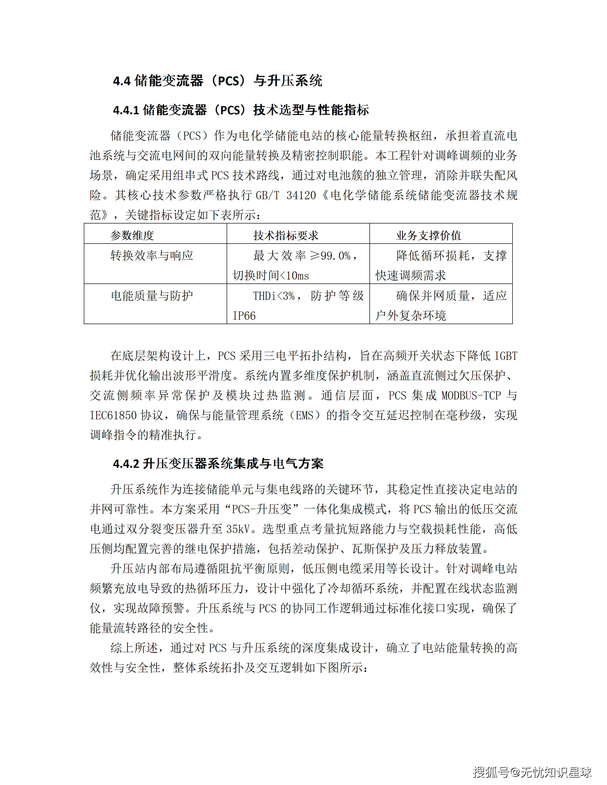 本方案在PCS选型上体现出技术前瞻性:采用碳化硅(SiC)功率器件,满载转换效率≥99.1%,相较招标文件要求的98.5%实现"正偏离"。 对于百兆瓦级储能电站,这0.6%的效率差异在全年循环中意味着数以百万度计的电量损耗差异,直接影响运营经济性。三电平拓扑结构确保THDi<3%的并网质量,PCS集成IEC61850协议支撑与调度平台的毫秒级指令交互。