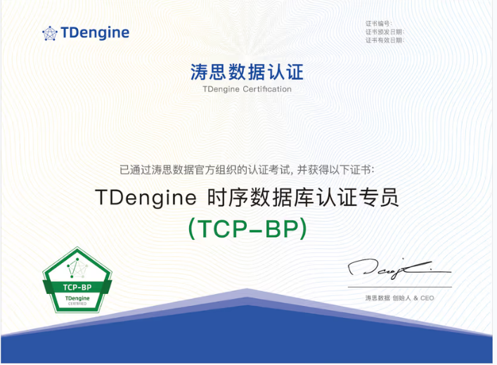 TCP-BP (TDengine Certified Professional -- Basic Practitioner)是涛思数据 TDengine 时序数据库的官方入门级认证 ,全称 "TDengine 数据库认证专员",
