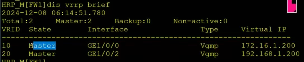 - FW1 正常情况下为VGMP Active(主设备),所有 VRRP 组为 Master