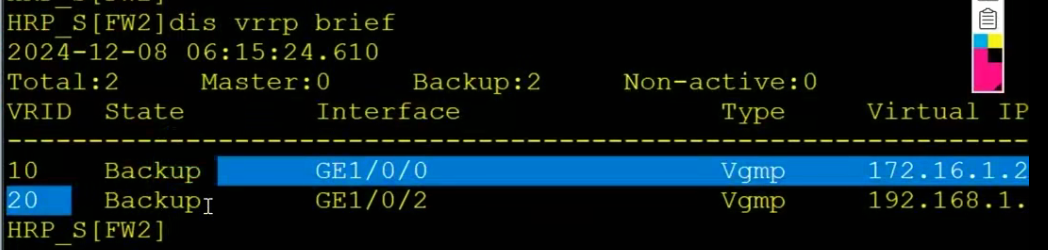 - FW2 正常情况下为VGMP Standby(备设备),所有 VRRP 组为 Backup