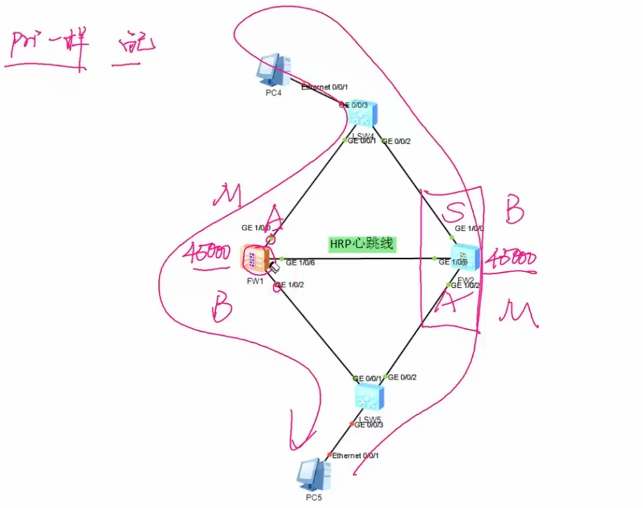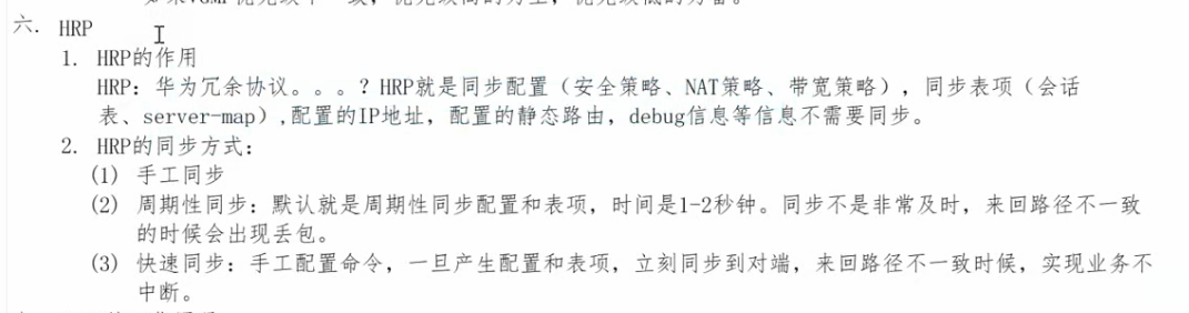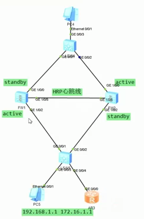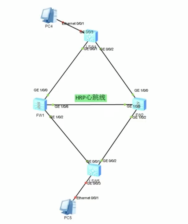 两台防火墙之间通过心跳线 连接,运行HRP(华为冗余协议) 。当在主用设备上执行一条命令时,这条命令会通过心跳线实时同步到备用设备上。