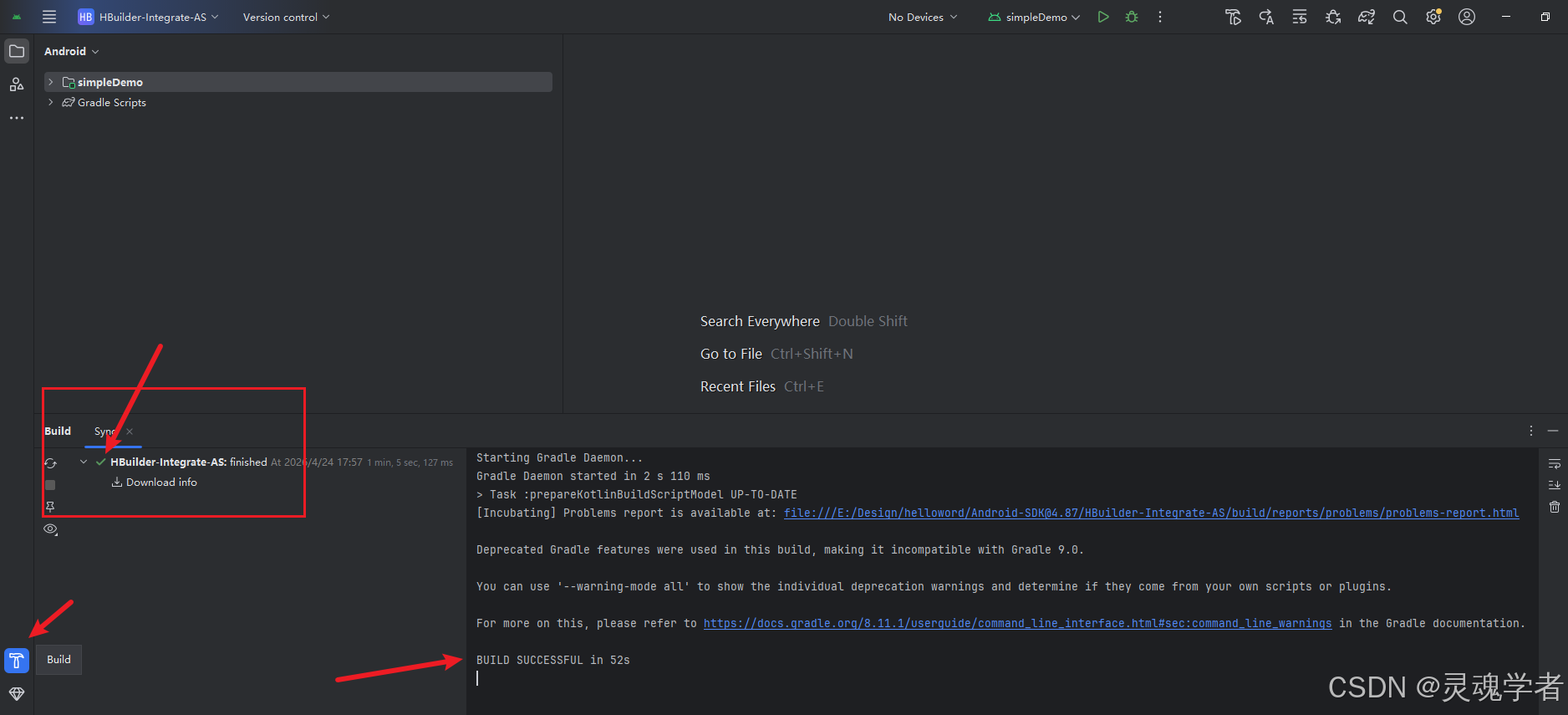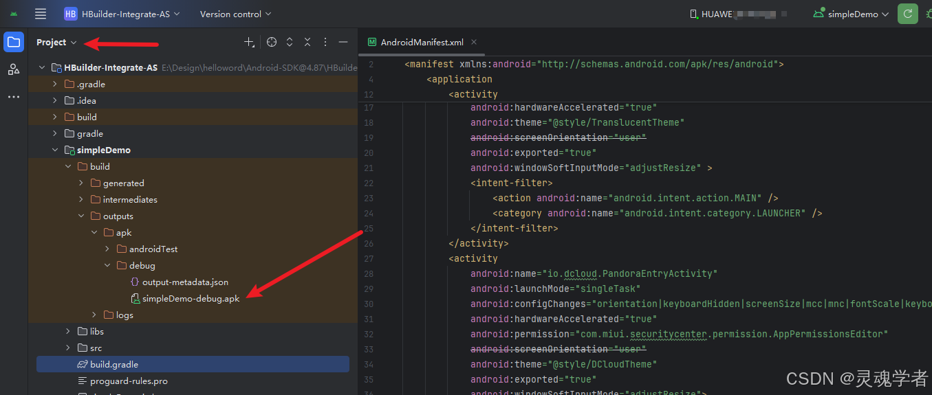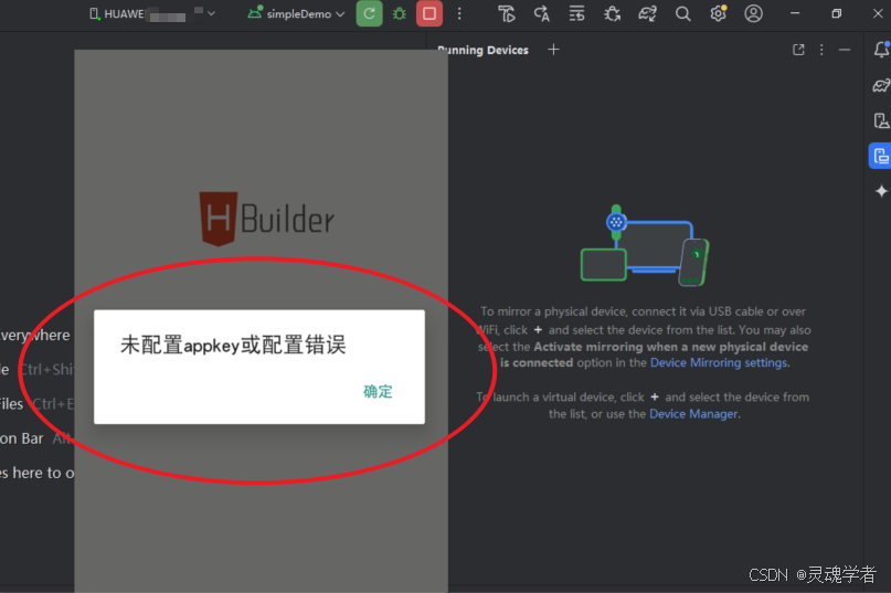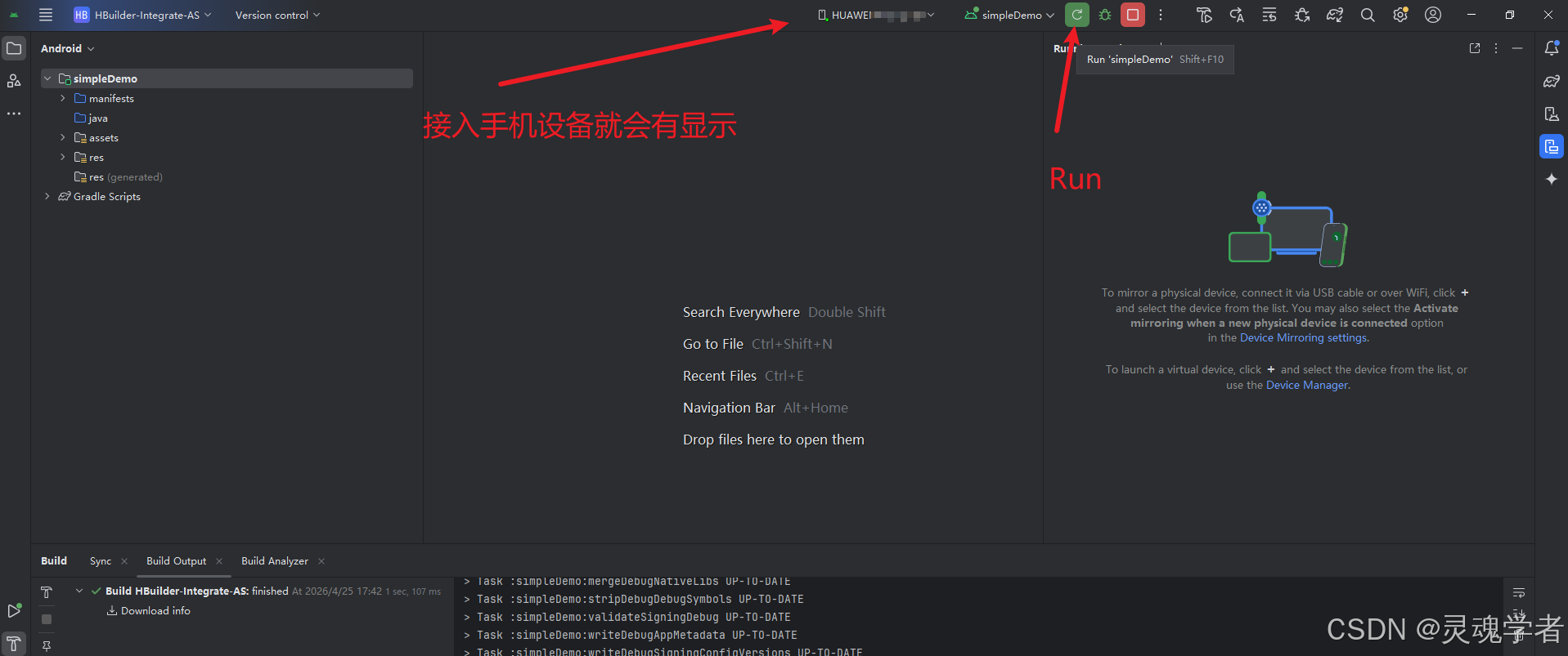 2.7.0之后提供HBuilder-Integrate-AS工程,可以直接导入HBuilder-Integrate-AS工程,直接运行simpleDemo项目即可。