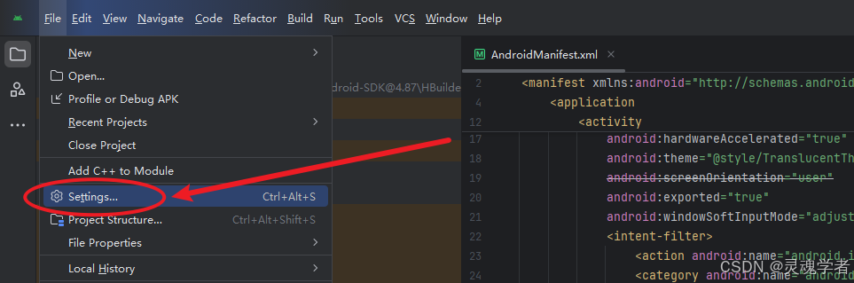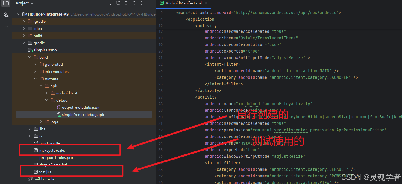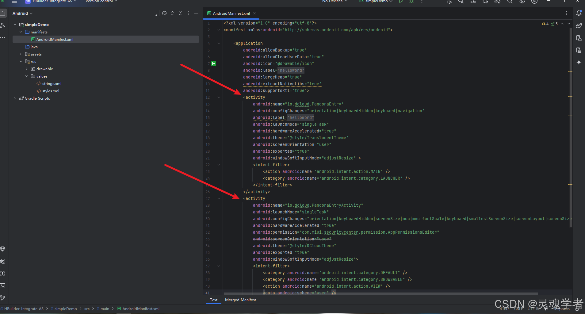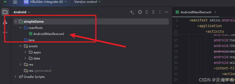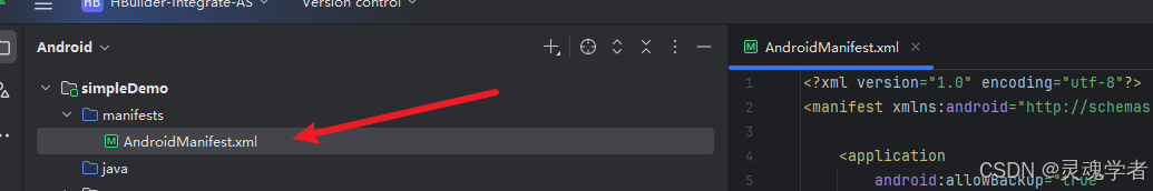 回到 Android Studio 程序中,我们找到这个文件【Androidmanifest.xml】进行配置信息: