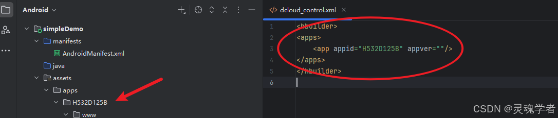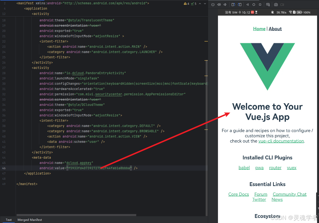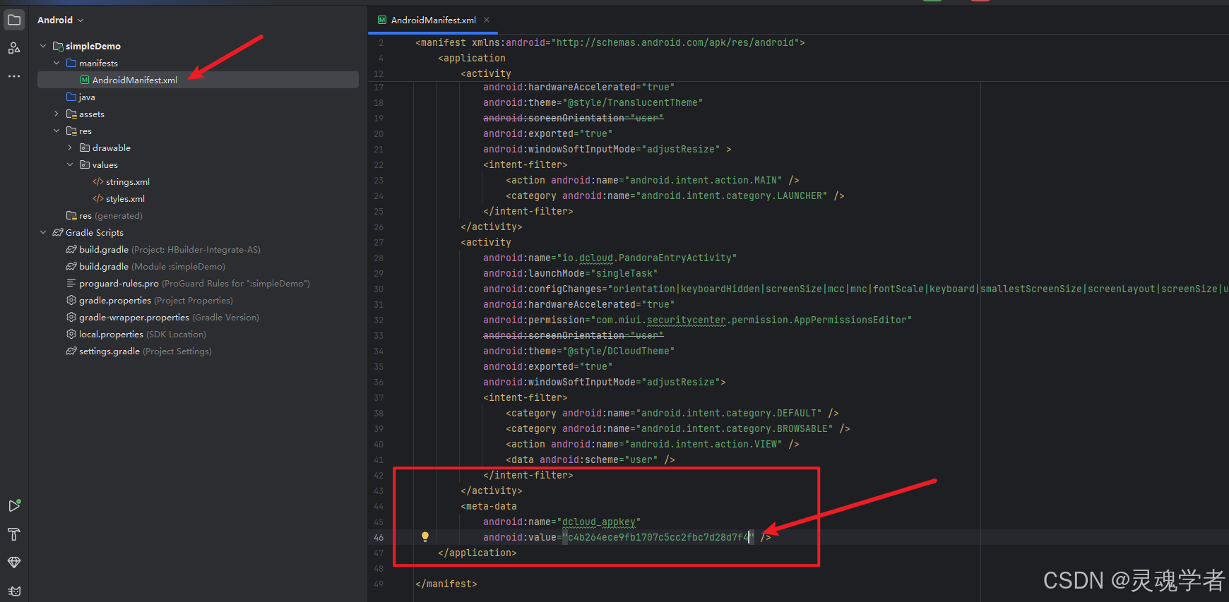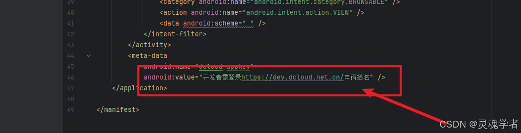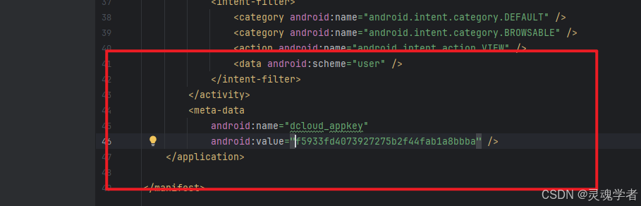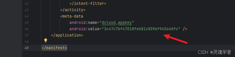 打开这个文件之后,滑动代码页面到最底部, 导航到Application节点,创建meta-data节点,name为dcloud_appkey,value为申请的AppKey。