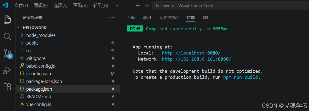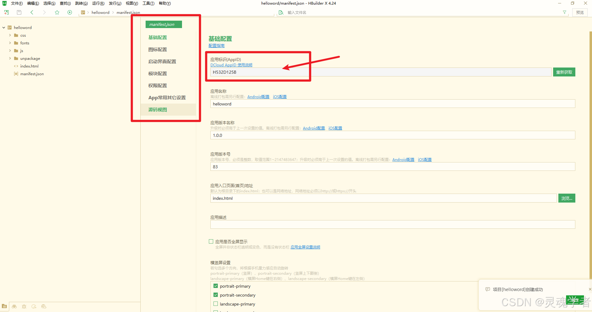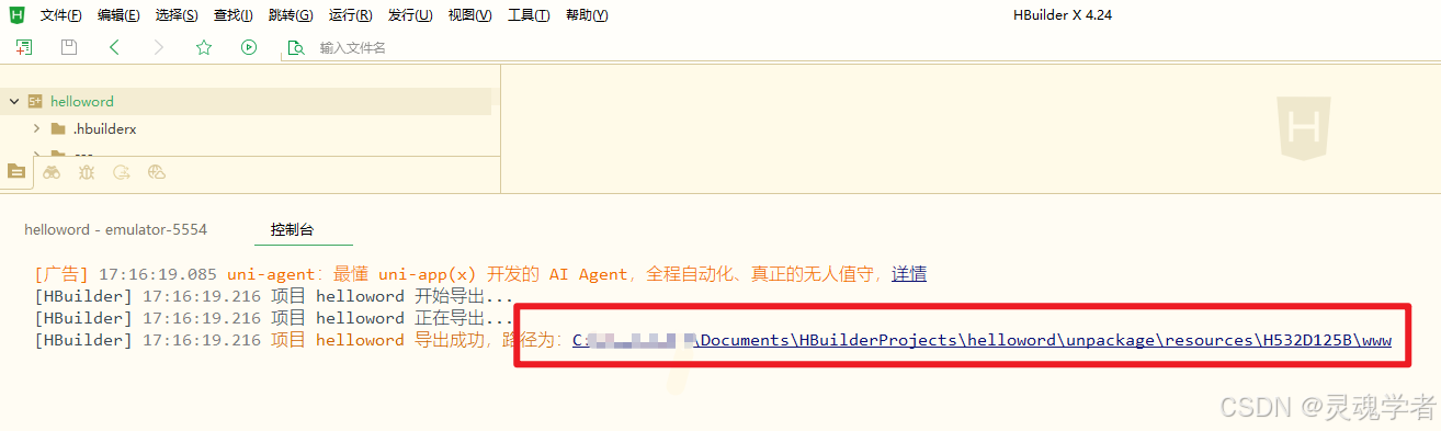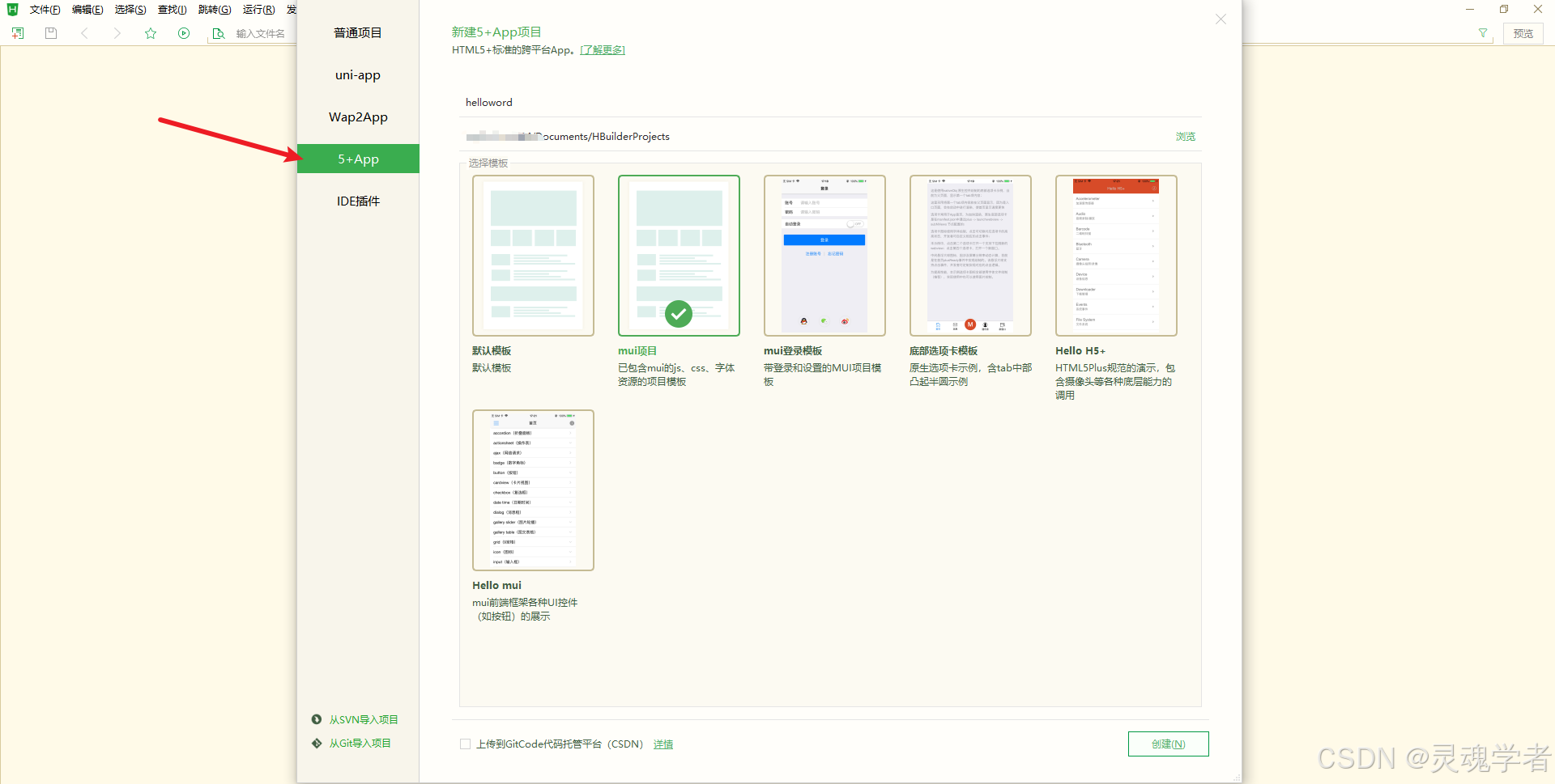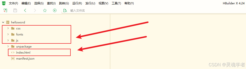 这一步我们就要将我们在 VsCode 打包出来的 dist 放进 H5+App 项目里,dist 文件夹就是纯前端静态资源(html、js、css、图片);打开 HbuilderX ,创建项目 helloword: