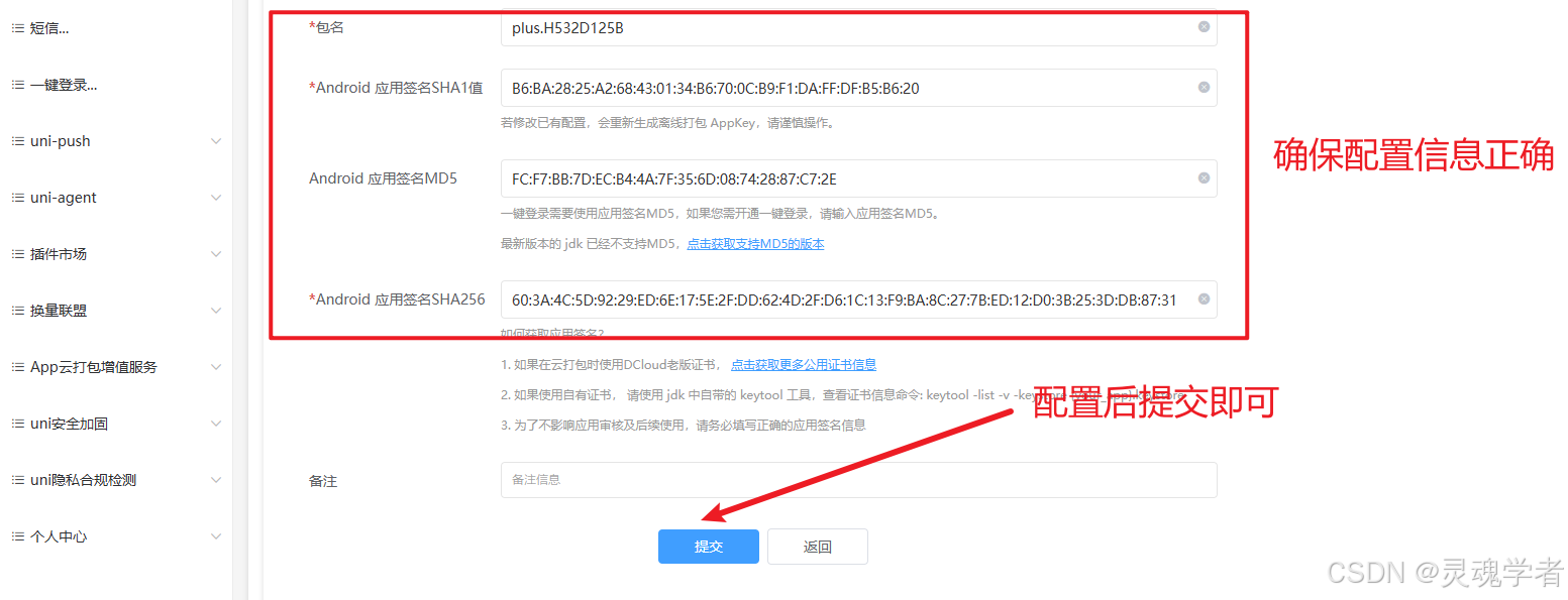 按照终端获取的信息配置到 DCloud 开发者中心去,完成之后点击提交即可。