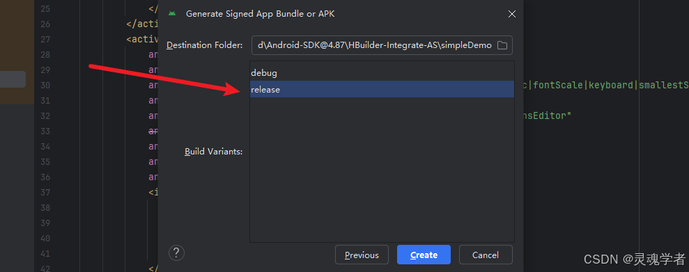 把刚刚创建的密钥库信息填写进去后,点击**【Next】** ,选择**【release】**就是发行版了。然后再点击【Create】继续,等待构建完成。