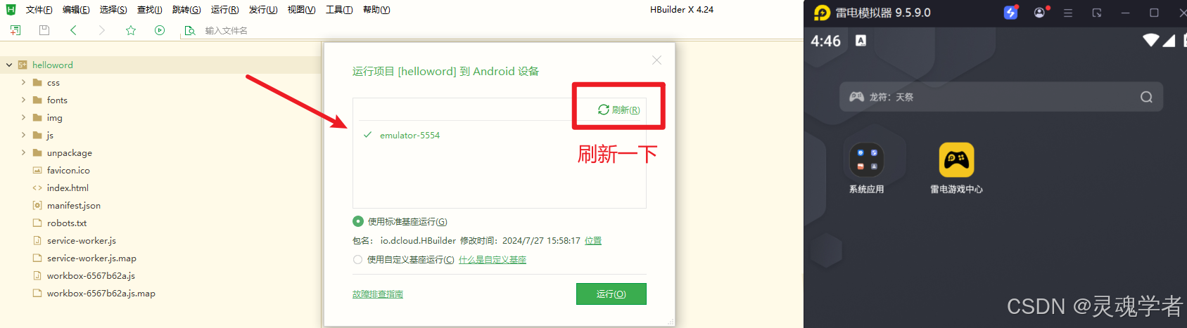 打开雷电模拟器之后,我们再回到 HbuilderX 来去刷新一下可以看到这个 Android 设备的选项,然后我们点击【运行】,等待安装进去,完成后会自动进入,如下