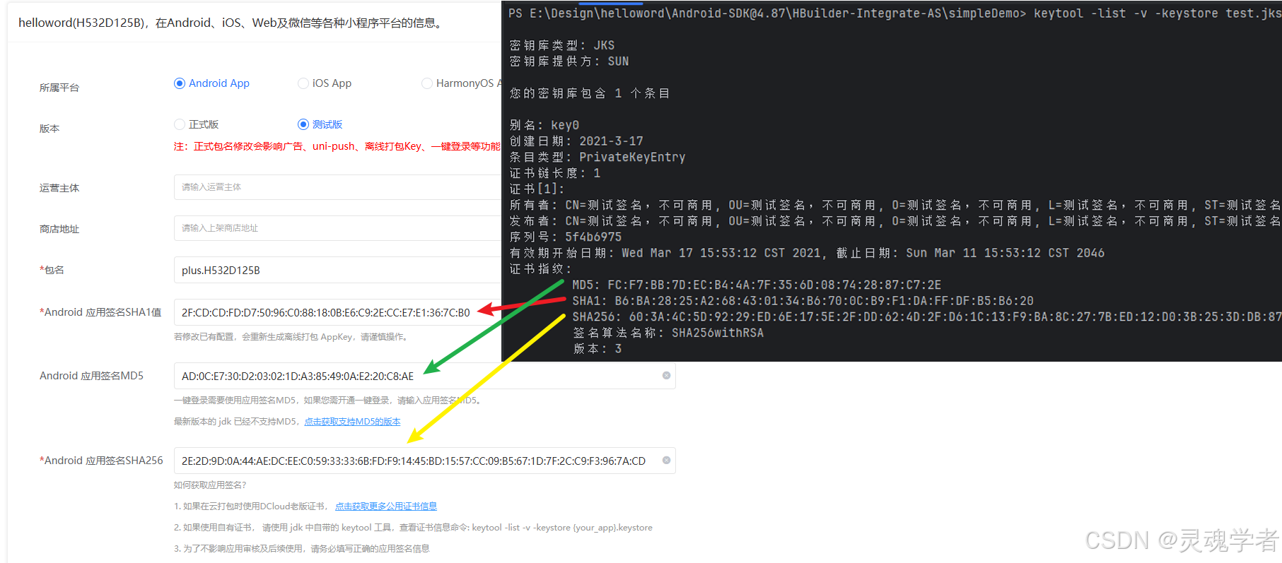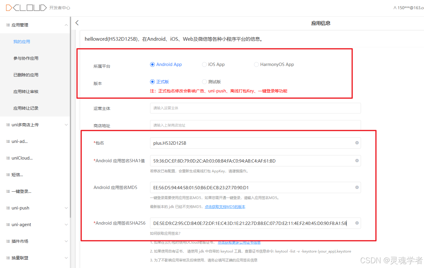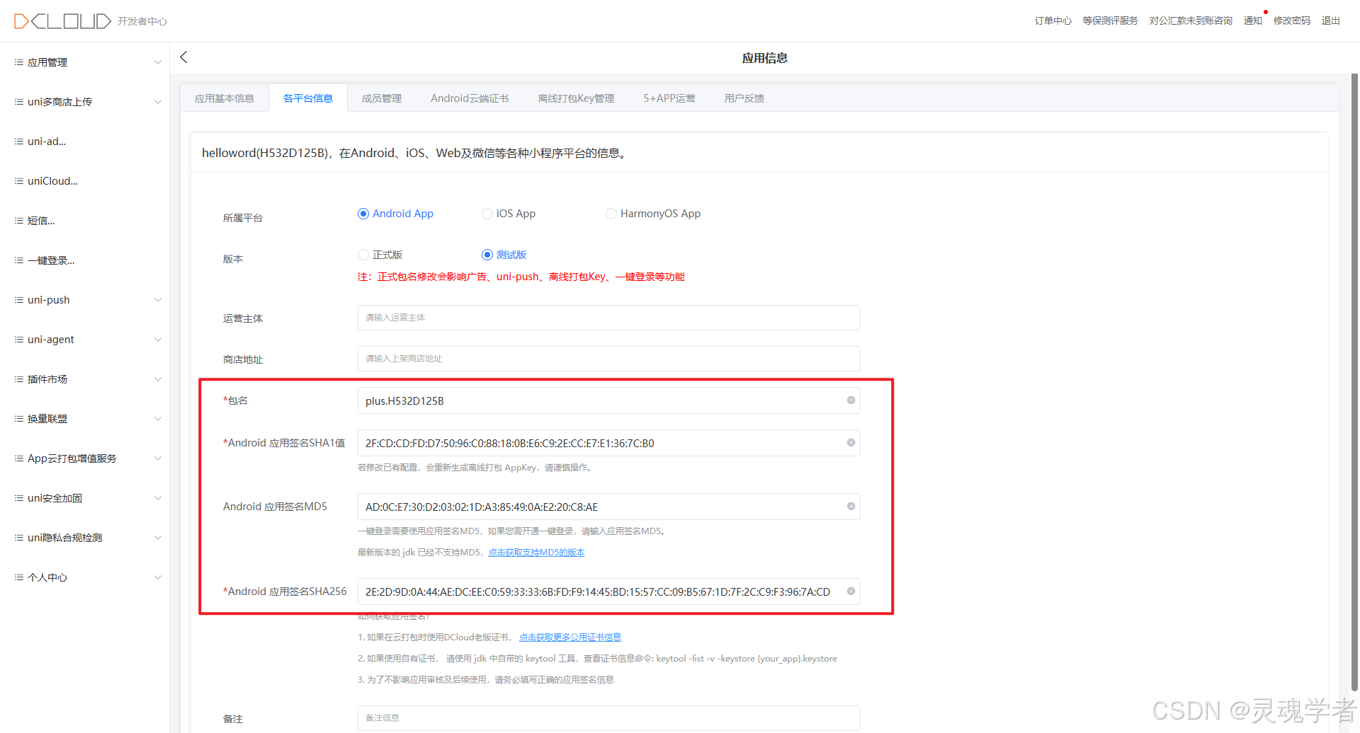 将终端生成的 SHA1 / MD5 / SHA256 都复制过来,粘贴到 DCloud 开发者中心内覆盖原来的内容,完成后点击提交即可。
