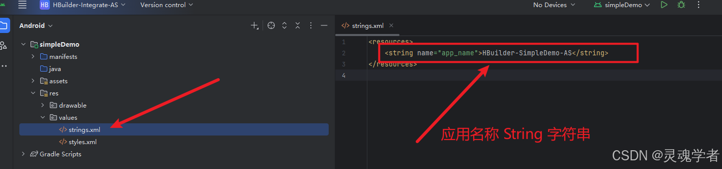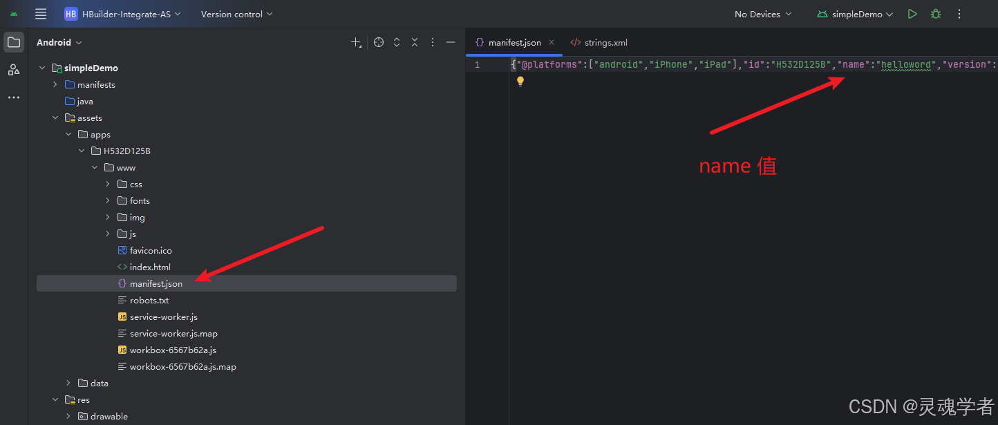 将 strings.xml 的配置信息换成 manifest.json 的 name 值即可(这个就是我们要打包成APK安装到手机桌面的应用名称了),如下: