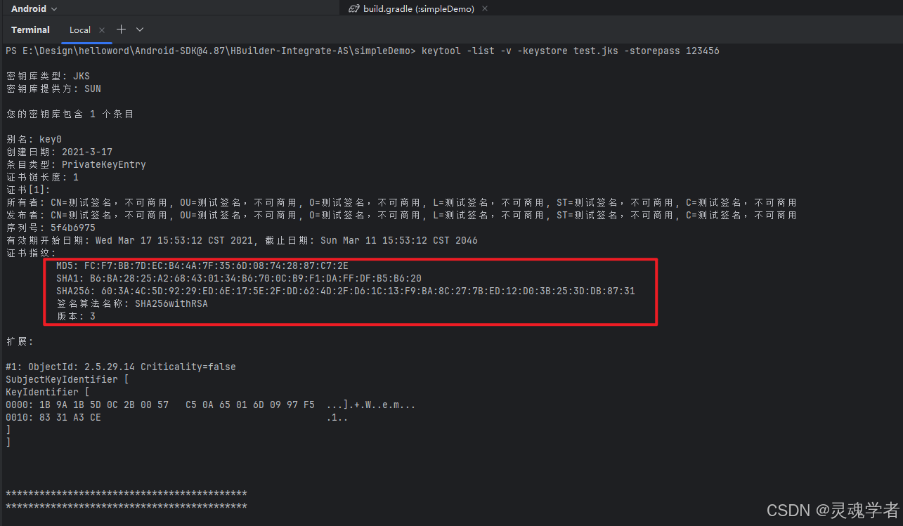 由于在【7.6.3】我们已经查看密钥库的内容了,其实就是获取SHA1了,通过新签名文件来去获取。