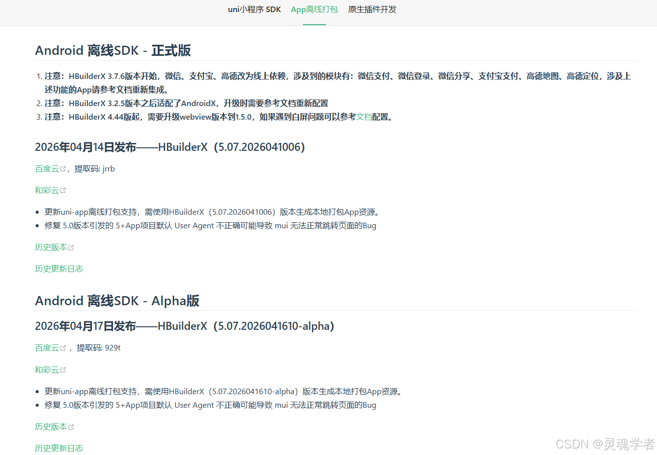 可以根据 DCLOUD 提供的 Android 离线打包SDK 地址下载,分为 正式版和Alpha版(测试版),可以根据自己的需要来去下载 DCLOUD ------ 离线打包SDK