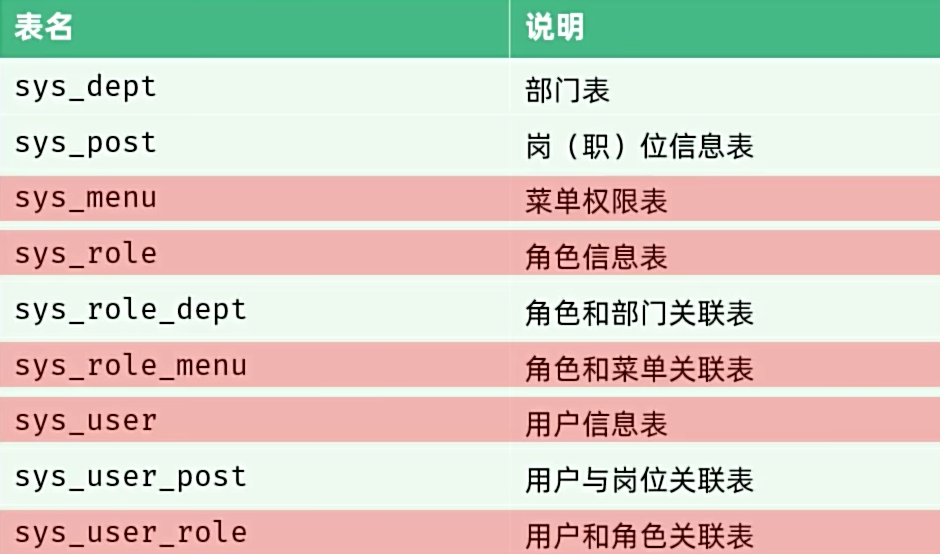 角色菜单中间表关系:用户配角色、角色绑权限,两张中间表维护多对多关系。