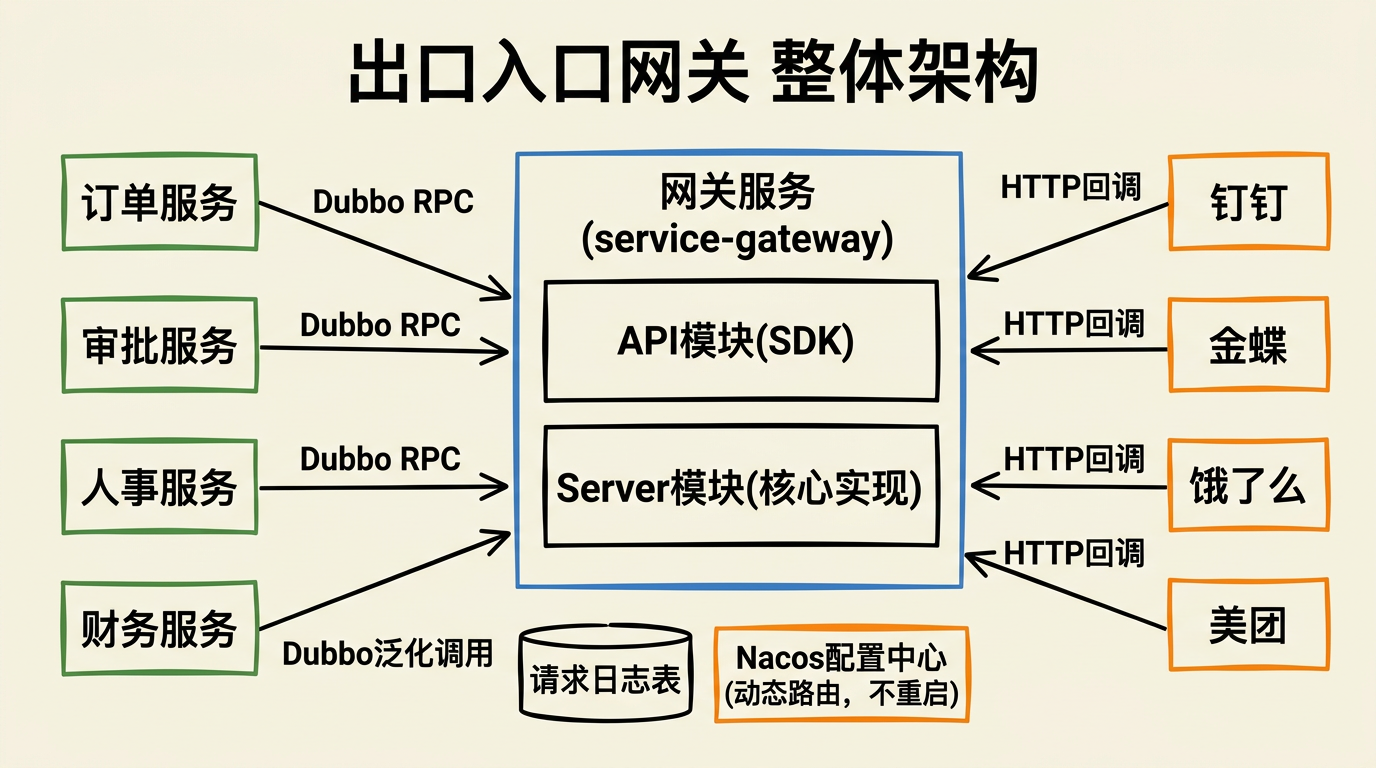 入口:第三方系统有回调通知时(比如钉钉审批状态变更回调、支付结果回调),统一由网关接收,再转发给内部对应的微服务处理。