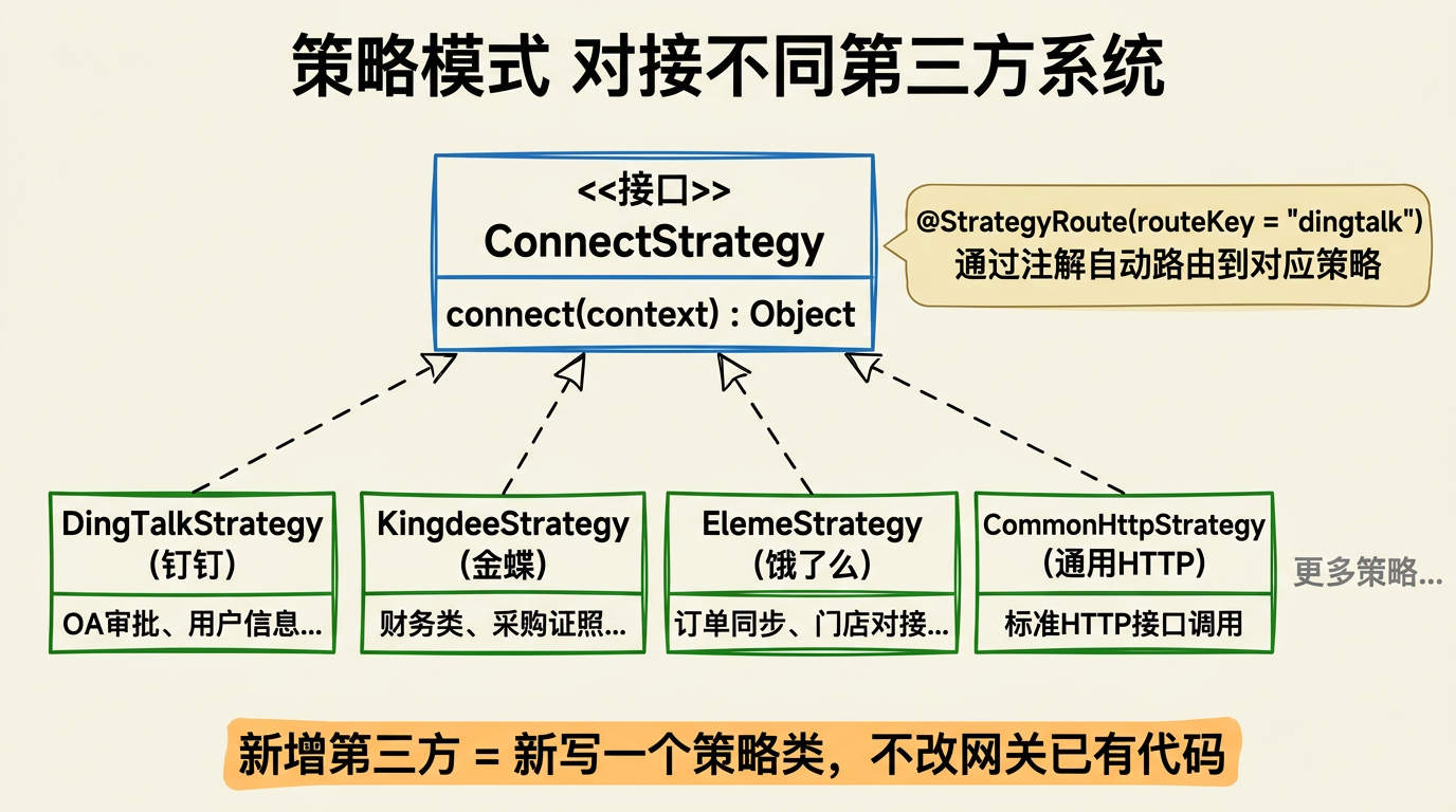 用策略模式来处理这个差异。定义一个连接策略接口,每个第三方系统对应一个策略实现类: