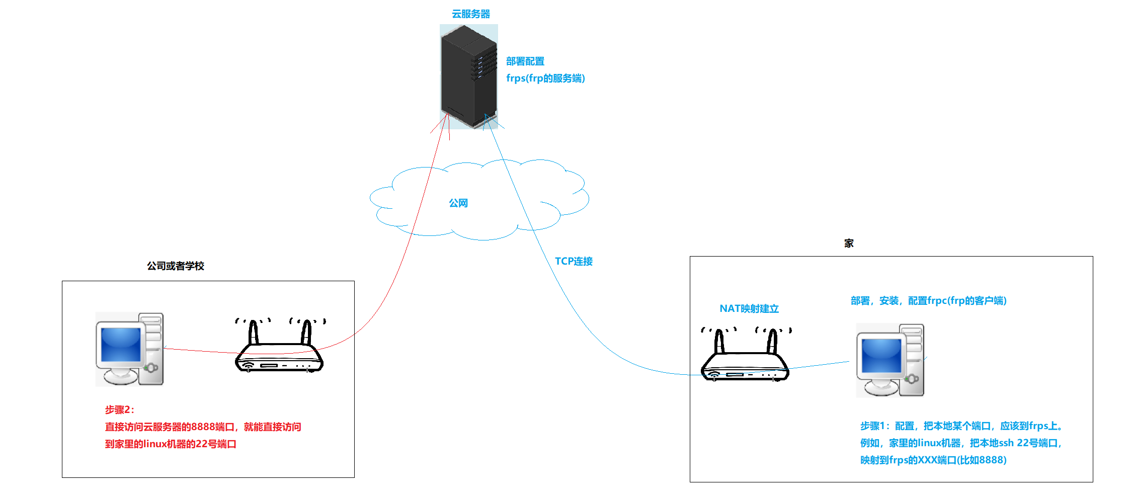 就是用这个云服务器的8888映射到你的22号端口,此时你在学校和公司访问你家的linux机器,此时你只需要访问这个云服务器的8888端口即可。