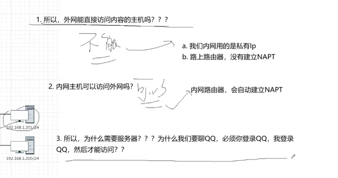 思考第三个问题,因为我们登录QQ的过程就是你在给QQ的服务器通过NAT路由器拿着全局IP访问QQ的服务器,此时自动就建立起来了NAPT关系,此时我给你发送一个信息,其实是发送到服务器,服务器拿着你要发送给哪台主机,此时就拿着这个目的IP去访问逆向的去访问我们接收方的主机。