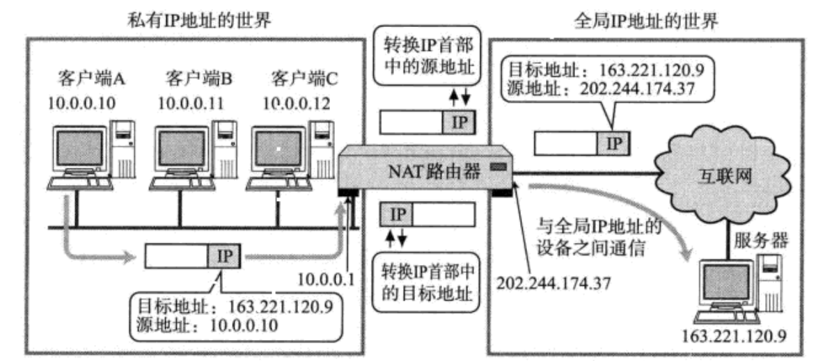 很多学校, 家庭, 公司内部采⽤每个终端设置私有IP, ⽽在路由器或必要的服务器上设置全局IP;