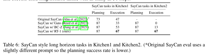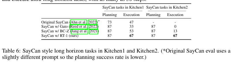 实验结果如表 6 所示(对应指令详见附录表 12)。除原生 SayCan 外,其余所有方法的规划成功率均为 87%;其中 RT-1 表现最优,在一号厨房的任务执行成功率达 67%。
