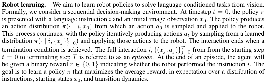 机器人目标是学习一个策略 π,最大化在指令、初始状态 x0 和转移动态的分布上的期望平均奖励。