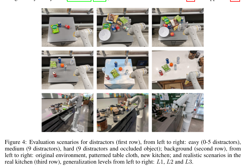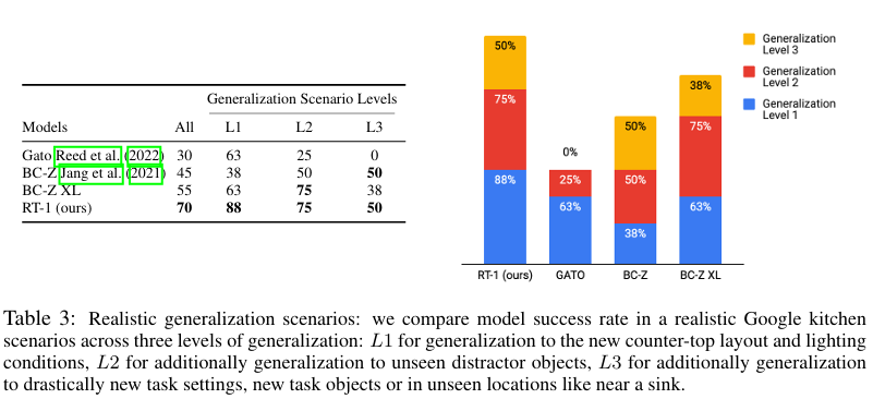 表 3 统计了不同泛化等级下的任务成功率:RT-1 在全难度等级中鲁棒性最优。Gato 在简单 L1 级场景泛化表现尚可,但复杂场景下性能断崖式下跌;BC-Z 及 BC-Z XL 在 L2 级表现中等、L3 级优于 Gato,但整体泛化能力仍远不及 RT-1。