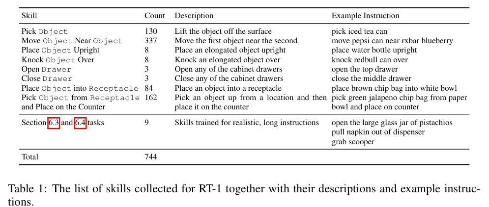 - 为了将这些指令分组在一起,将它们分为多个技能(例如,"pick"、"open"或"place upright"等动词)和对象(例如,"coke can"、"apple"或"drawer"等名词)。