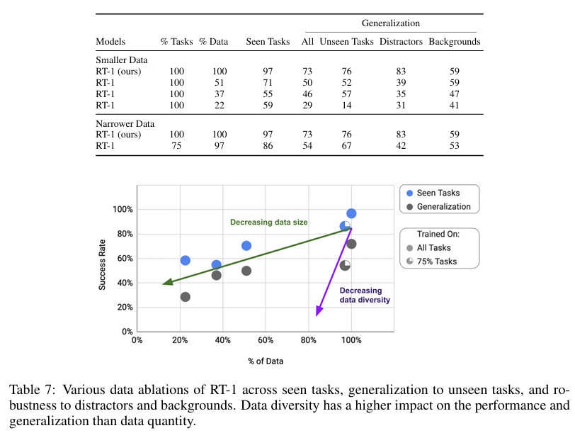本节最后一项研究问题,聚焦分析 RT-1 在不同数据特征下的性能缩放规律。