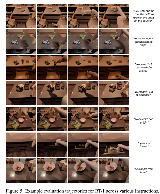 RT-1 表现优异:干扰物场景任务成功率 83%,背景陌生场景成功率 59%,分别高出次优模型 36%、18%。整体而言,RT-1 不仅基础执行能力更强,同时具备极强的跨场景泛化与环境鲁棒性。图 5 展示了 RT-1 在不同技能、环境、物体交互中的运行轨迹案例;