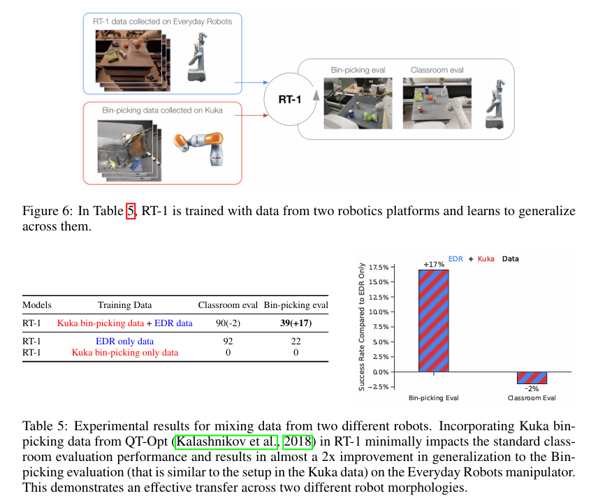 实验结果如表 5 所示:融合双机器人数据后的 RT-1,通用教室场景任务性能仅下降 2%,原有能力基本保留;在箱体抓取专项任务中,跨数据训练模型成功率达 39%,远高于仅用原生数据训练的 22%,性能提升近一倍。