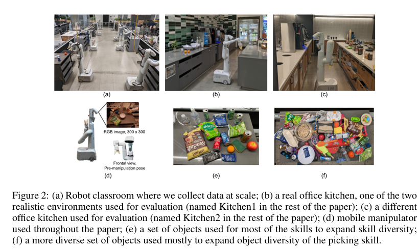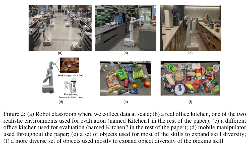 - 两个真实的办公室厨房和一个模拟这些真实厨房的训练环境。训练环境如图2(a)所示,由部分柜台构成,用于大规模数据收集。