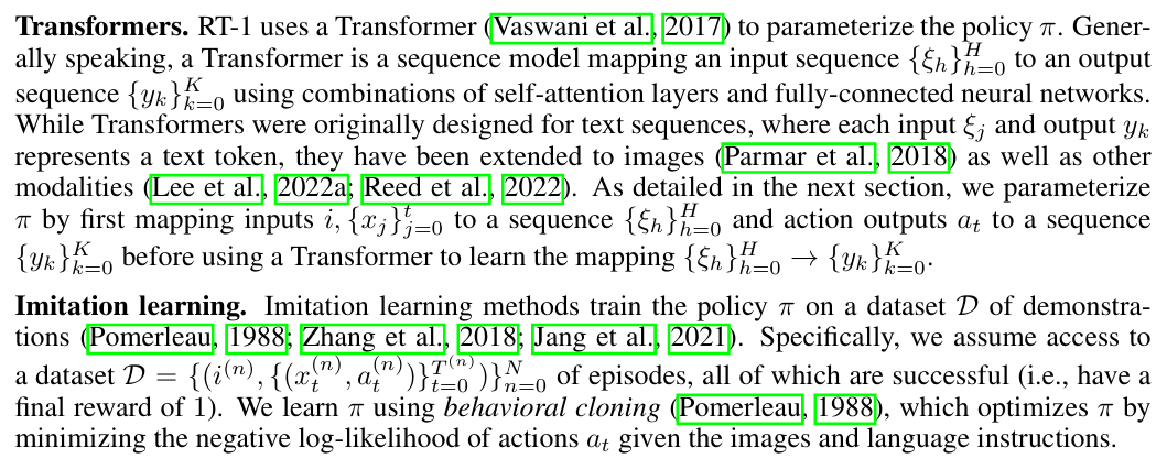 - 提出新结构:提出Robotics Transformer,一个能够消化海量多样性的机器人数据的高容量的模型结构