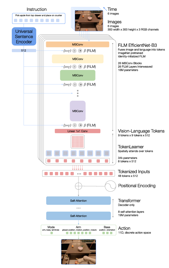 指令被转换为一个USE-embedding,并通过FiLM层对预训练的EfficientNet进行条件处理(与各层的视觉特征进行融合)。生成的视觉语言tokrn经过TokenLearner减少后,再送到一个仅包含解码器的Transformer中,该Transformer输出token化的动作。如下图所示: