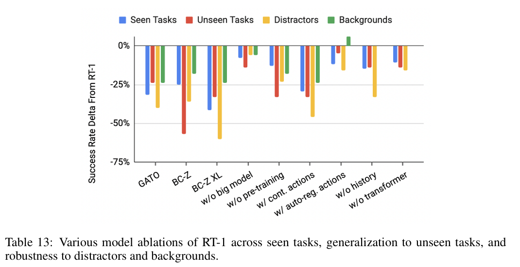 实验结果如表 2 所示:在所有测评维度中,RT-1 性能均大幅领先基线模型。