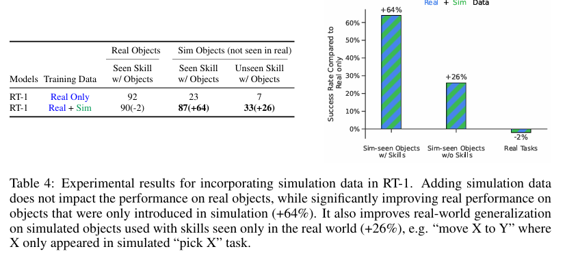 表 4 对比了 RT-1 与基线模型融合真实 + 仿真数据的效果。实验固定全部真实演示数据,额外补充仿真场景数据集,包含现实中从未出现的虚拟物体。测评分为三类场景: