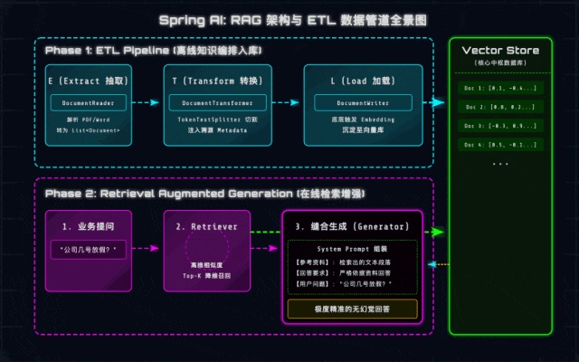 在Spring AI中,整个RAG的宏大工程被优雅地拆分成了两个核心阶段:阶段一(离线知识编排入库ETL)和阶段二(在线检索增强)。这两个阶段分工明确、相互配合,构成了企业级RAG应用的完整链路,也是咱们Java开发者需要重点掌握的工程化逻辑。