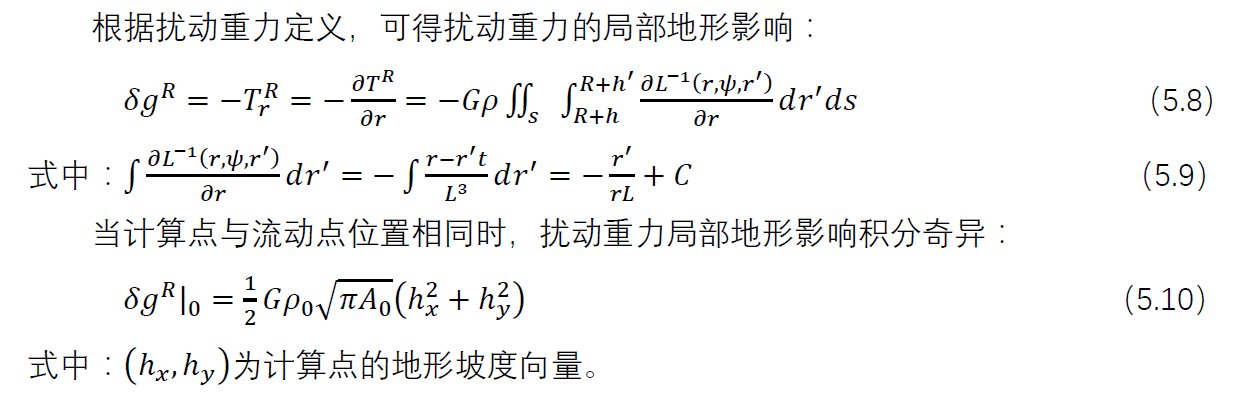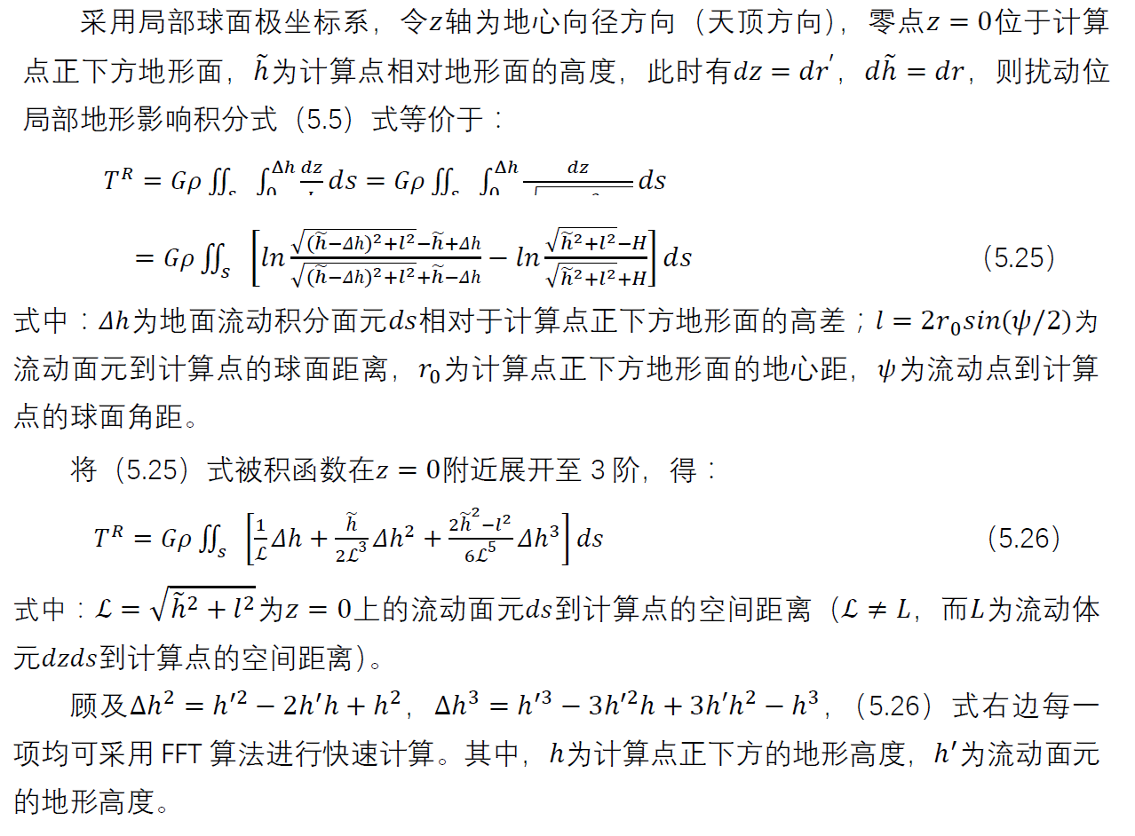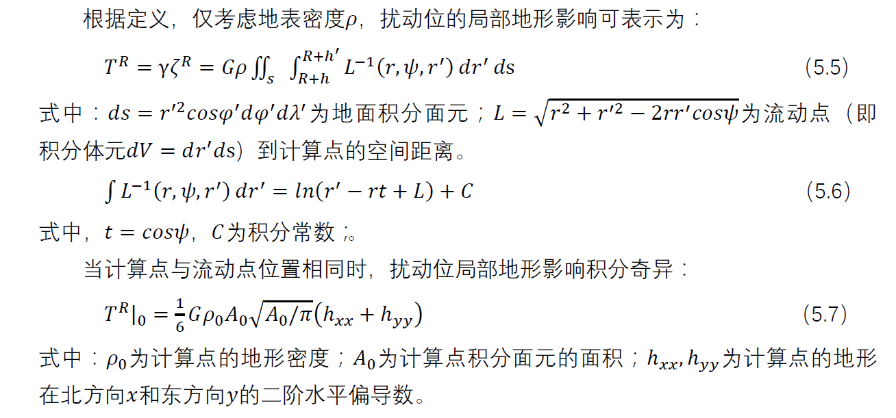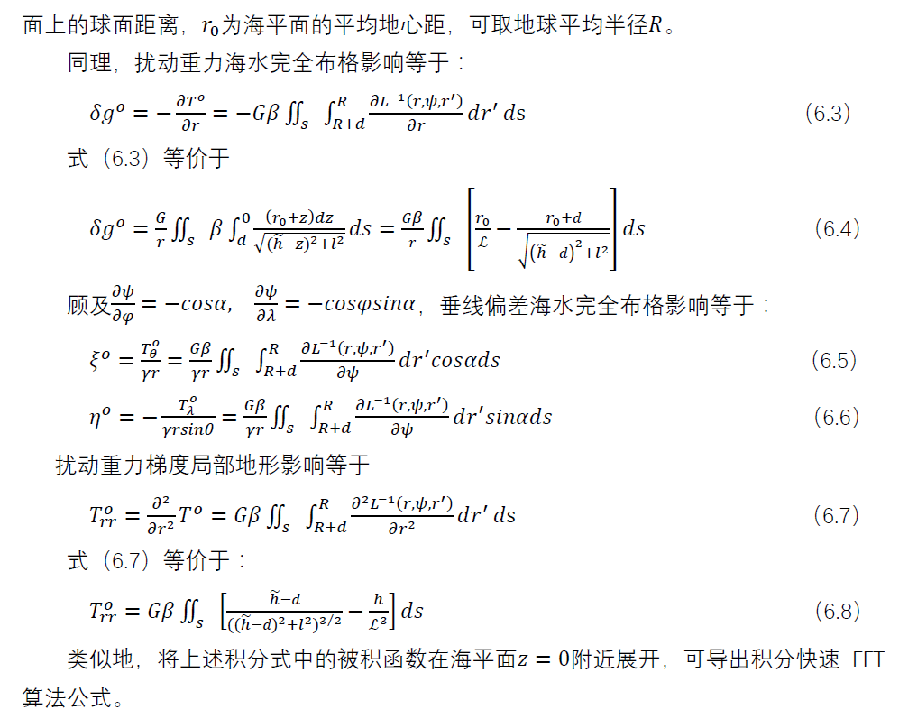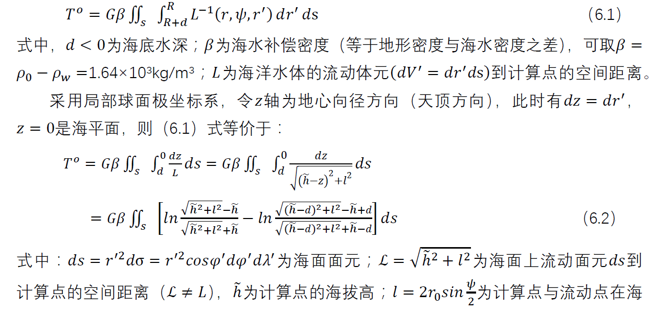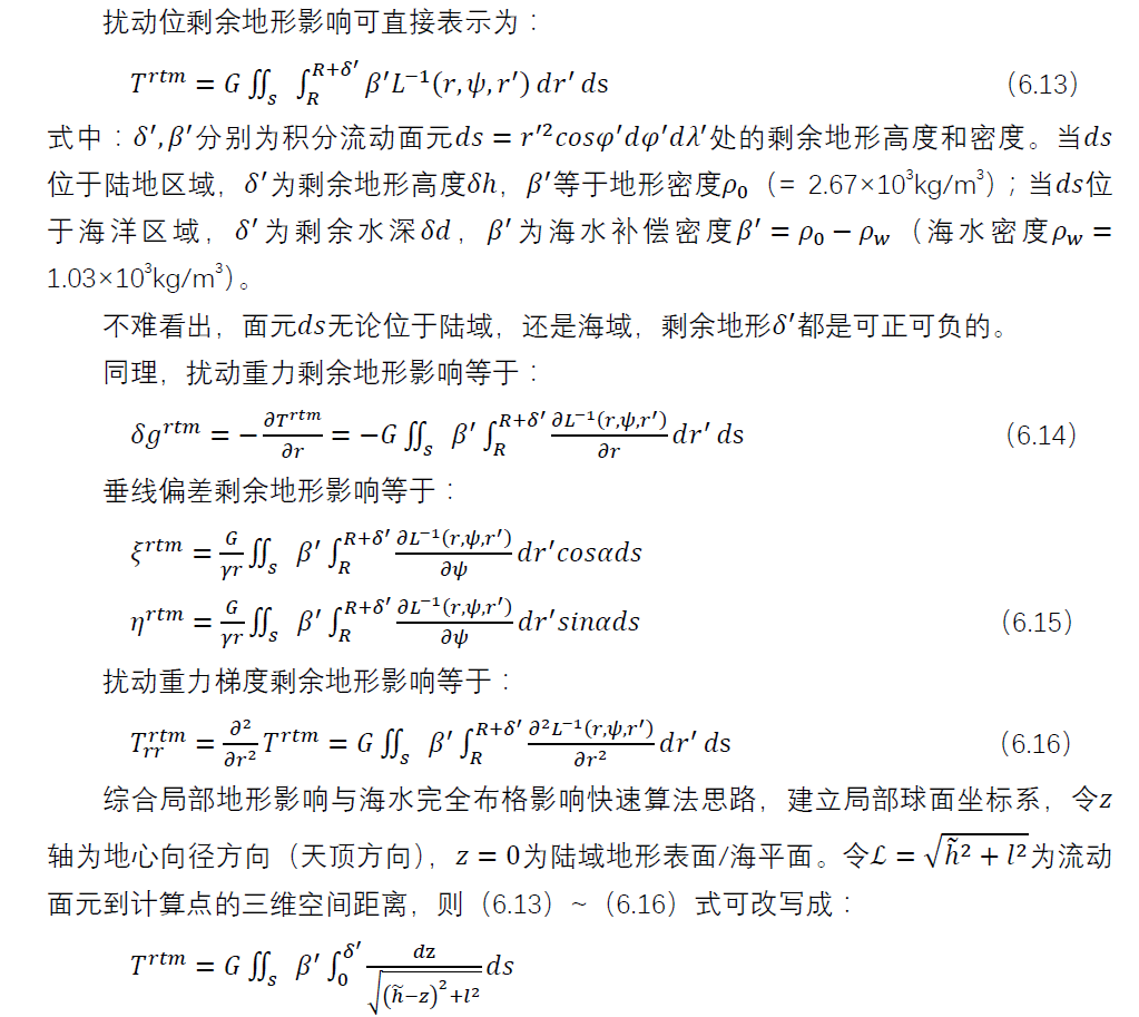 剩余地形影响积分公式,与局部地形影响和海水完全布格影响的积分公式在形式上相同,只是采用的积分流动体元密度和径向积分域存在一些差异。