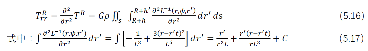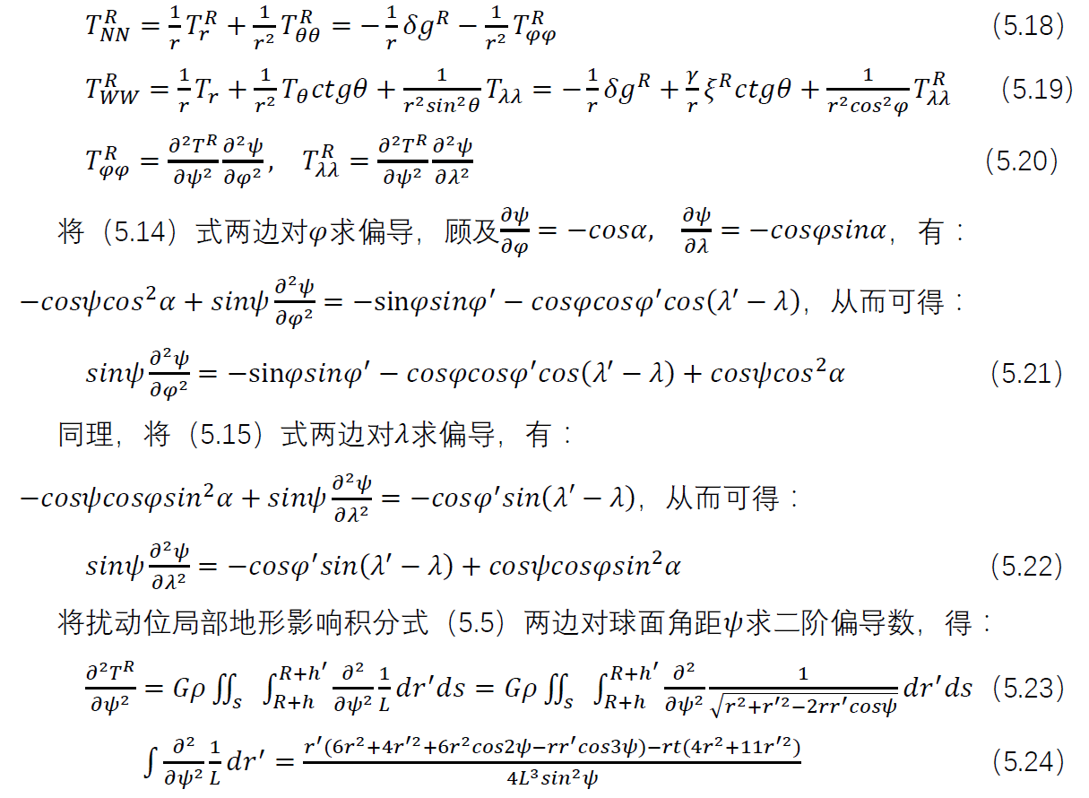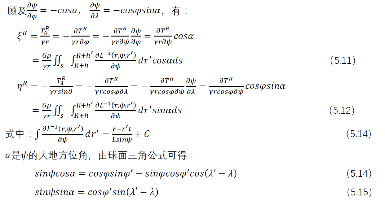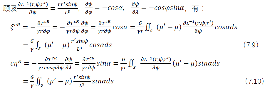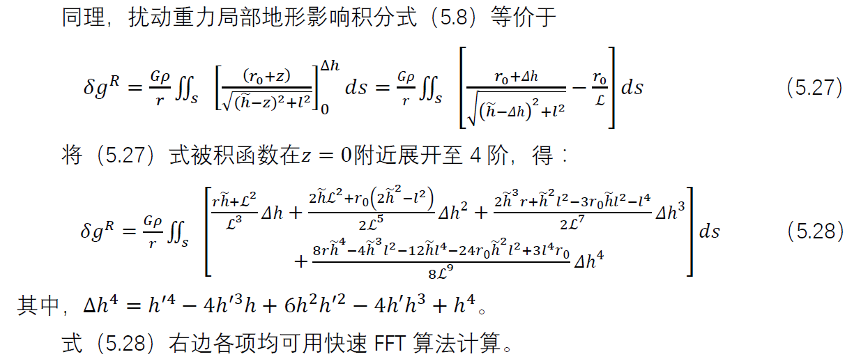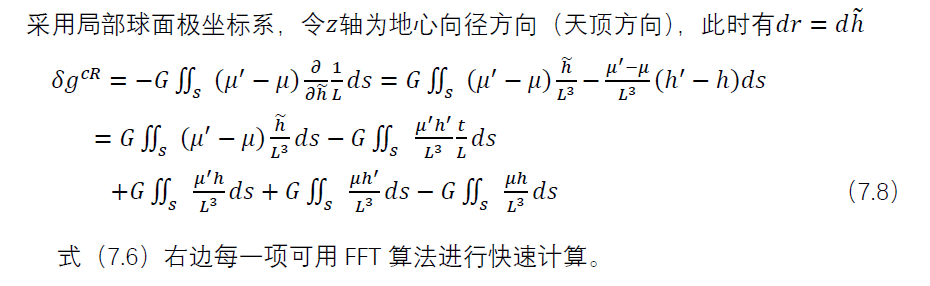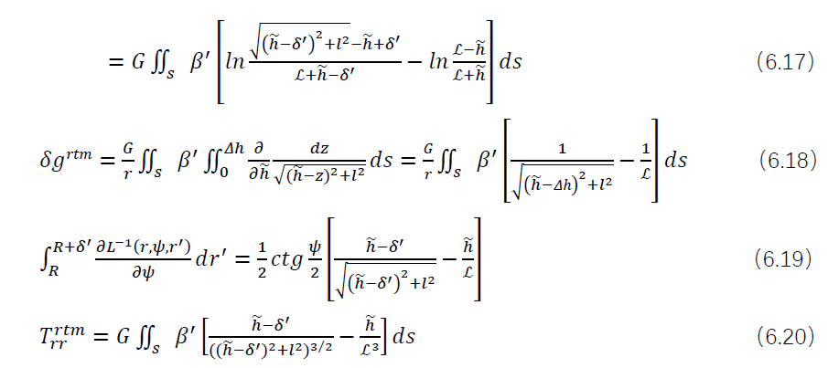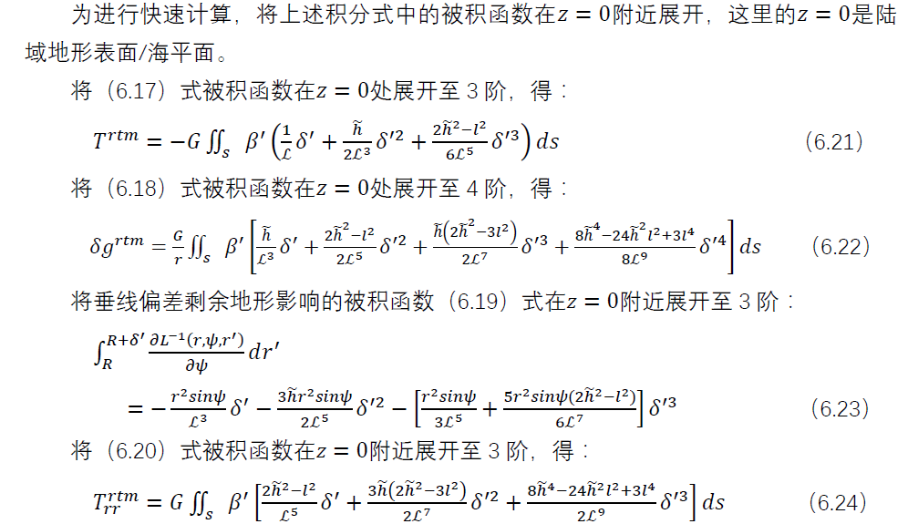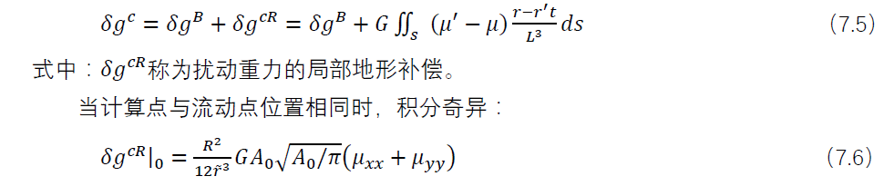 剩余地形影响积分公式,与局部地形影响和海水完全布格影响的积分公式在形式上相同,只是采用的积分流动体元密度和径向积分域存在一些差异。