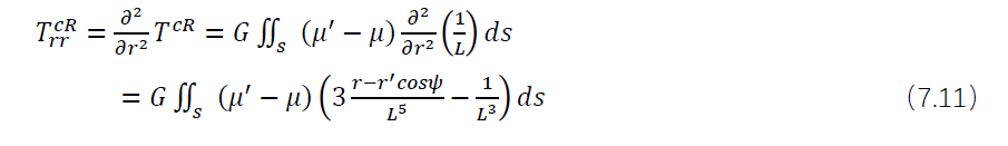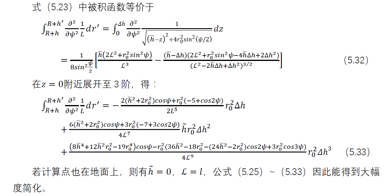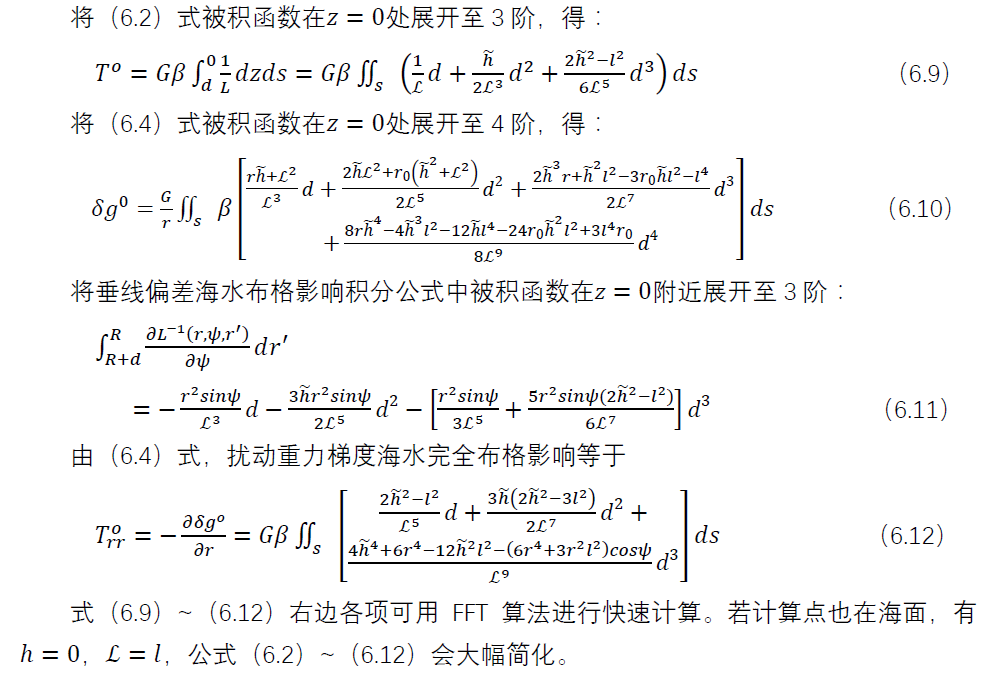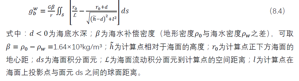 重力(空间异常/扰动重力)的海水完全布格影响计算方法参考7.5.4节,其严密积分公式为: