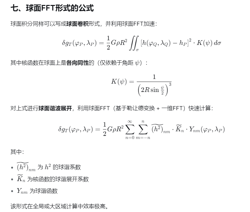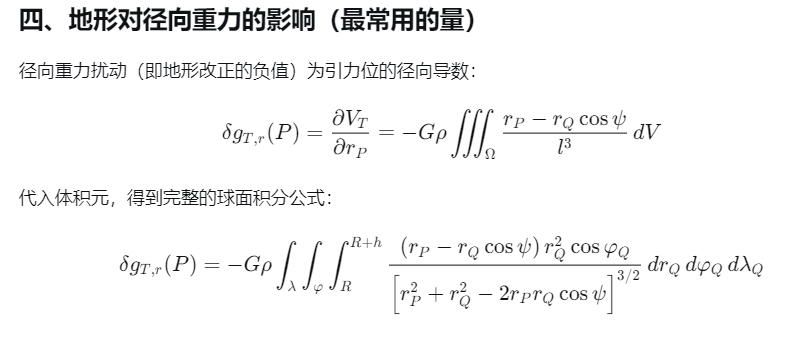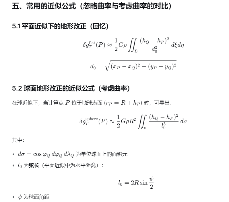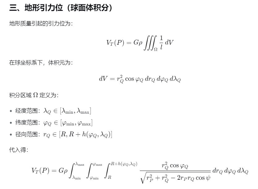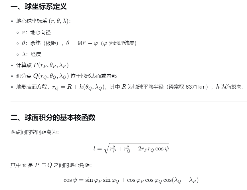 在球近似下,局部地形影响的积分公式需要从平面直角坐标系转换到球坐标系。这里给出最常用、最严密的球面积分公式,包括引力位、重力矢量(径向分量)以及地形改正的完整表达。
