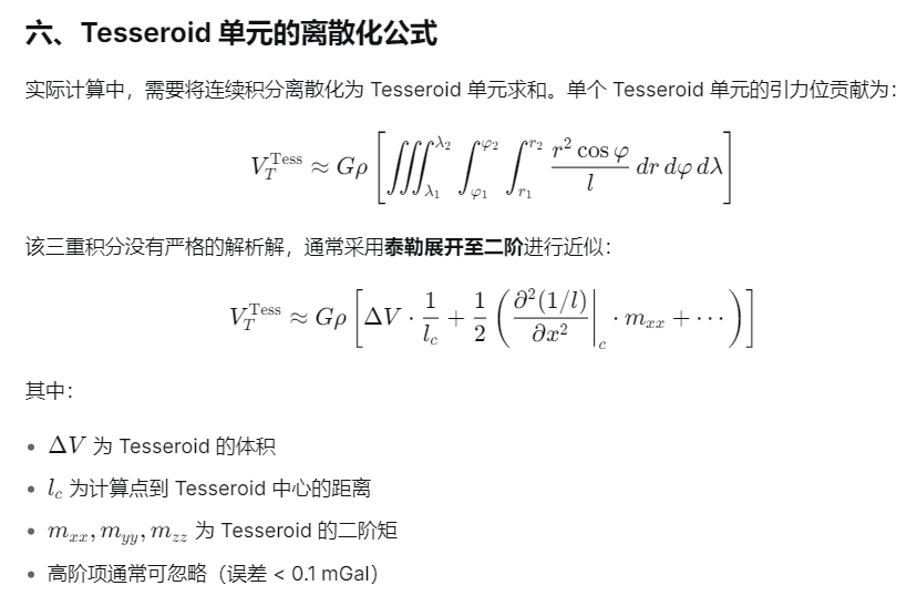 计算策略与精度控制:由于 Tesseroid 单元的引力积分通常没有闭式解,实践中主要通过泰勒级数展开法来进行近似计算。泰勒展开的阶数直接影响计算的速度与精度,展开到二阶项通常在大多数情况下就能满足精度要求,这需要在计算速度和精度之间进行权衡。