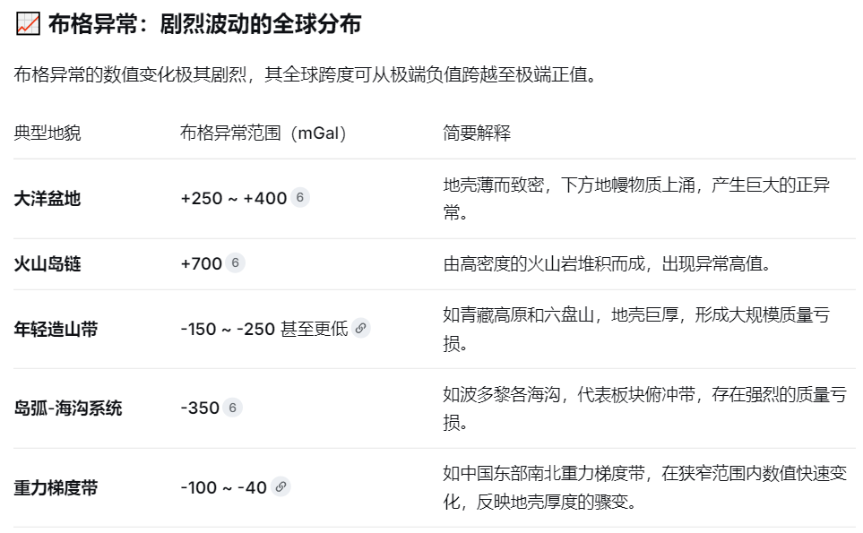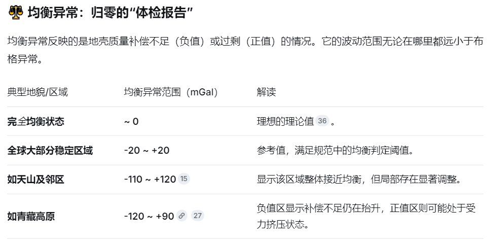 这两者的数值范围差异非常大:布格异常的全球变化幅度可达上千毫伽。而均衡异常本身就是为了消除这种大幅波动而设计的,它的数值通常在一个很小的范围内(如±100多毫伽)变动,且全球总和接近于零。