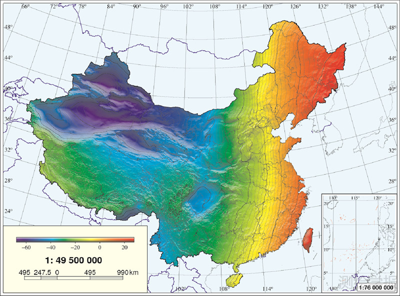 下图是李建成院士采用EIGEN03C为参考场确定中国最新2′×2′重力似大地水准面模型CNGG2011,该模型的高程异常最小和最大值分别为-67.901 m和27.996 m。