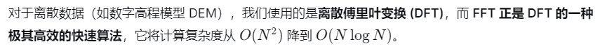 频率域:用不同频率的"波纹"来描述同一个东西。低频成分对应大尺度、缓慢变化的地形(如山脉的整体趋势);高频成分对应小尺度、剧烈变化的地形(如局部陡崖、沟壑)。