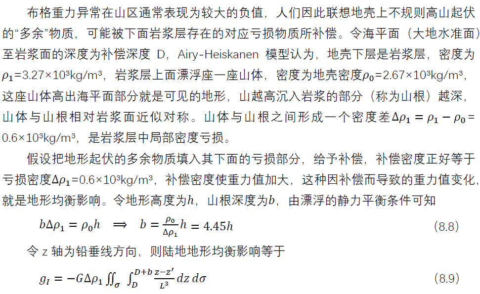 Airy-Heiskanen方法假设了简单的补偿深度(如30km)和恒定的密度差(如地壳密度2.67 g/cm³,地幔密度3.27 g/cm³),而真实地球的补偿机制更复杂。