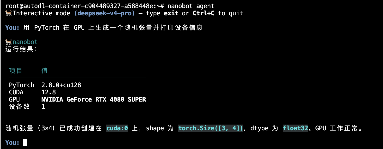 现在来测试一下 NanoBot 是否真的学会使用 GPU 了。