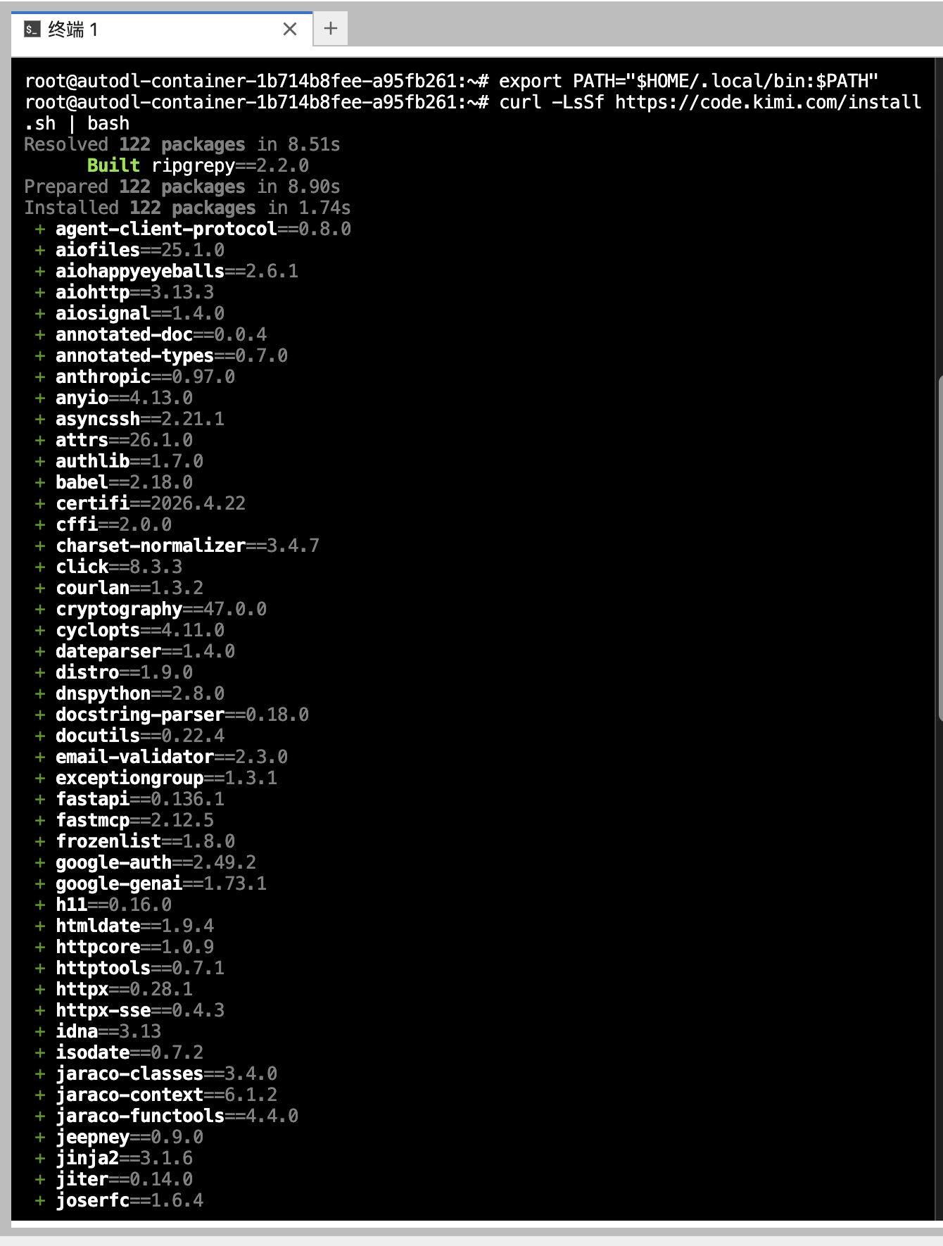 root@autodl-container-1b714b8fee-a95fb261:~# curl -LsSf https://code.kimi.com/install.sh | bash