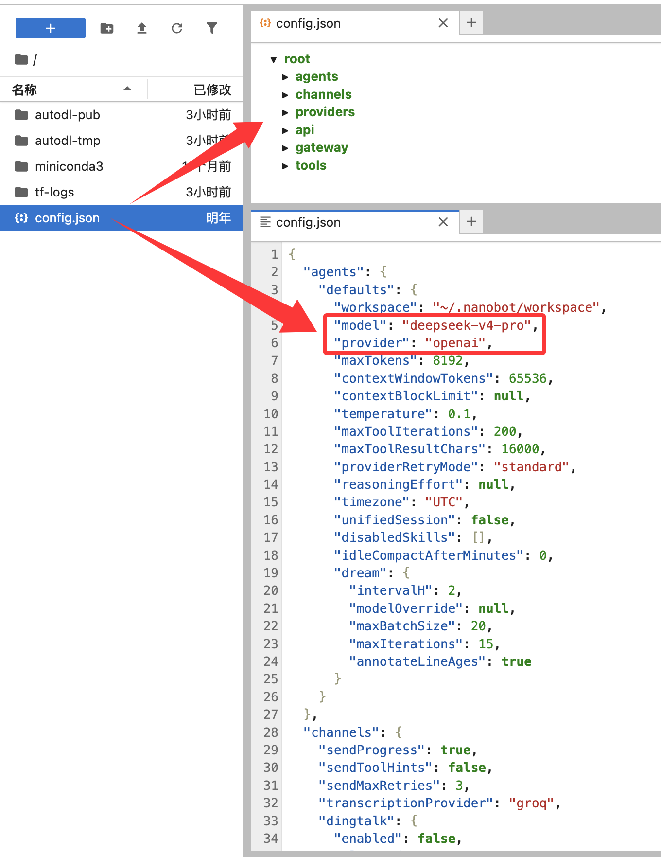 在 AutoDL 上可以通过以下方式打开 /root/.nanobot/config.json: