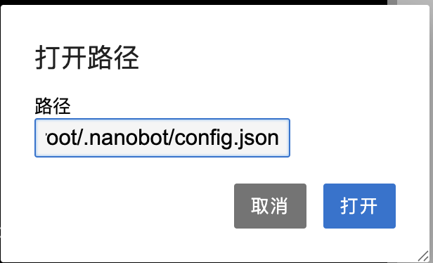 方式一 :文件 → 从路径打开,然后输入 /root/.nanobot/config.json