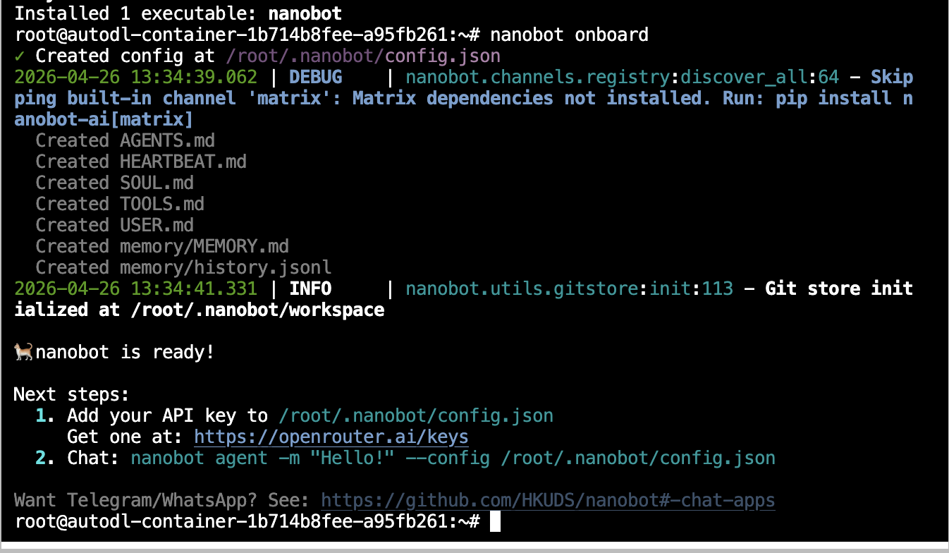 root@autodl-container-1b714b8fee-a95fb261:~# nanobot onboard