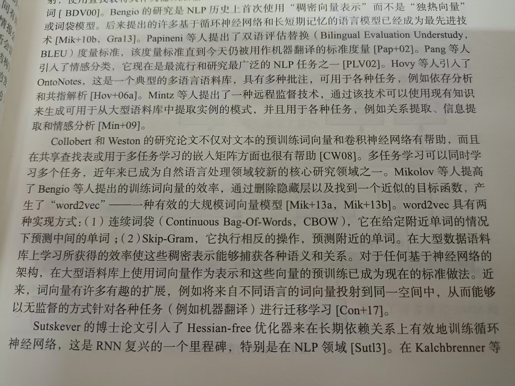 21世纪初,Bengio等人在21世纪初提出了第一个神经语言模型,该模型使用n个前面单词的映射,使用查找表将其作为隐藏层输入到前馈网络,并通过softmax层平滑输出结果以预测单词。Bengio的研究是NLP历史上首次使用"稠密向量表示"而不是"独热向量"或词袋模型,https://chat.deepseek.com/share/m2rbgel8r1xtwesusm。后来提出的许多基于循环神经网络和长短期记忆的语言模型已经成为最先进技术。Papineni等人提出的双语评估替换度量标准直到今天仍被用作机器翻译的标准度量。Pang等人引入了感情分类。......